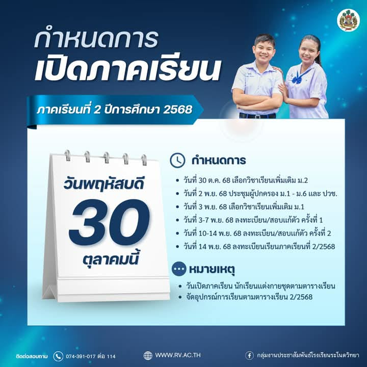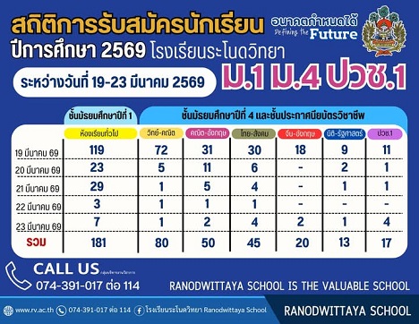 ประกาศรายชื่อผู้มีสิทธิ์เข้าศึกษาต่อชั้นมัธยมศึกษาปีที่ 1 ชั้นมัธยมศึกษาปีที่ 4 และประกาศนียบัตรวิชาชีพ ชั้นปีที่ 1 ประเภทห้องเรียนทั่วไป โรงเรียนระโนดวิทยา ประจำปีการศึกษา 2568