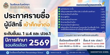 ประกาศรายชื่อผู้มีสิทธิ์เข้าศึกษาต่อมัธยมศึกษาปีที่ 1 ชั้นมัธยมศึกษาปีที่ 4 และประกาศนียบัตรวิชาชีพ ชั้นปีที่ 1 ประเภทห้องเรียนทั่วไป