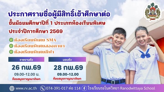 ประกาศ รายชื่อผู้มีสิทธิ์เข้าศึกษาต่อชั้นมัธยมศึกษาปีที่ 1 โรงเรียนระโนดวิทยา (ห้องเรียนพิเศษ)