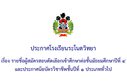 ประกาศรายชื่อผู้สมัครสอบคัดเลือกเข้าศึกษาต่อชั้นมัธยมศึกษาปีที่ 4 และประกาศนียบัตรวิชาชีพชั้นปีที่ 1 ประเภททั่วไป
