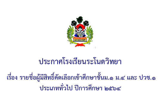 รายชื่อผู้มีสิทธิ์คัดเลือกเข้าศึกษาชั้นม.1 ม.4 และ ปวช.1 ประเภททั่วไป ปีการศึกษา 2564