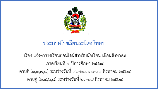 ประกาศโรงเรียนระโนดวิทยา เรื่อง แจ้งตารางเรียนออนไลน์สำหรับนักเรียน เดือนสิงหาคม ภาคเรียนที่ 1 ปีการศึกษา 2564